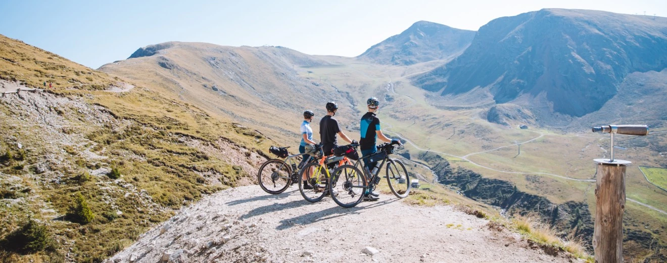 Nach einer ruhigen Nacht sorgen die Höhenlage und das frühlingshafte Klima für einen zügigen Start. Mit winddichten und verantwortungsvoll produzierten Löffler-Jacken bekleidet, verabschieden wir uns von unseren Gastgebern und machen uns auf den Weg. Die kurzen 100 Meter Aufstieg zur Passhöhe reichen aus, um ein wenig Körperwärme zu erzeugen.