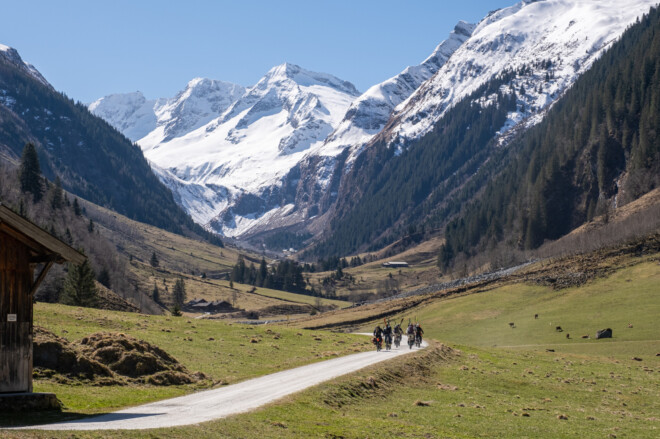 Unsere außergewöhnliche Skitour beginnt mit einer Zuganreise nach Lienz. Von dort geht es mit dem E-Bike über den Iselradweg und die Kalser Straße hinauf zur Lesachalm – eine sportliche Etappe mit 1.400 Höhenmetern auf 36 Kilometern. An der Lesachalm wechseln wir von den Rädern auf die Tourenski und steigen durch das beeindruckende Hintere Lesachtal in Kals am Großglockner auf das Böse Weibl. Nach rund vier Stunden und 1.300 Höhenmetern erreichen wir unseren Tageshöhepunkt. Von dort folgt eine rund 900 Höhenmeter lange Abfahrt hinunter zur Elberfelder Hütte, wo wir den Abend auf der Hütte ausklingen lassen.