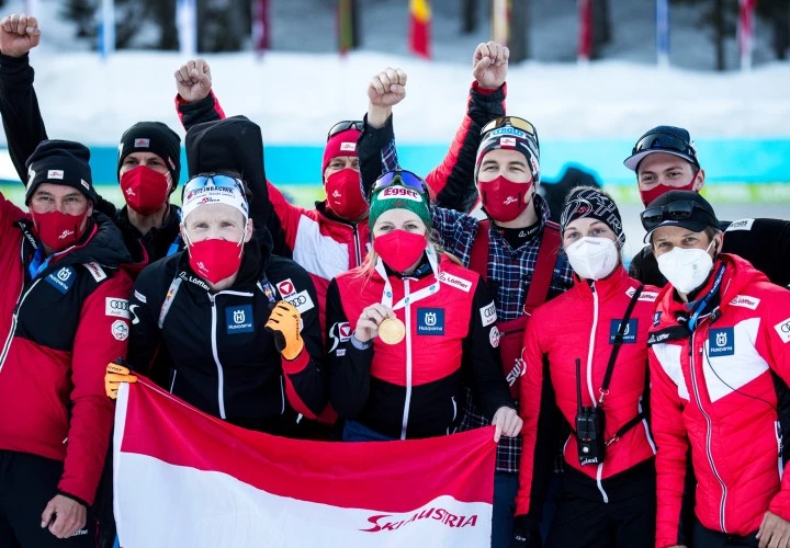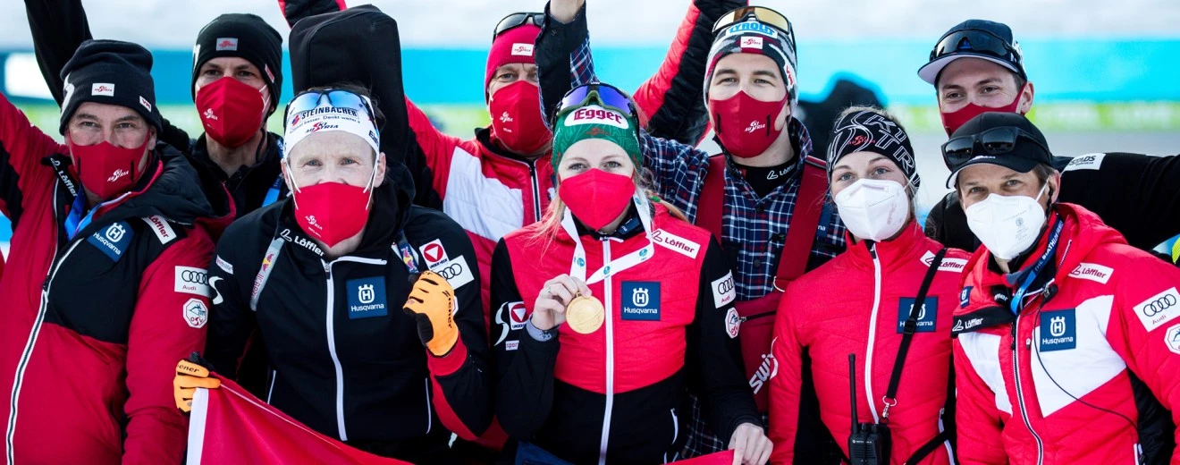Neben Rennanzügen und Warm-up-Bekleidung – bis zur Unterwäsche gehen die Biathleten mit LÖFFLER Bekleidung an den Start. Zur WM wurden die Ahtletinnen und Athleten mit einem neu entwickelten transtex® 3D-Hoody ausgestattet. transtex® wird bis heute in der LÖFFLER-Strickerei produziert. Damit machen die ÖSV-Stars wie Lisa Hauser, Simon Eder oder Julia Schwaiger auch abseits der Loipe eine Top-Figur.