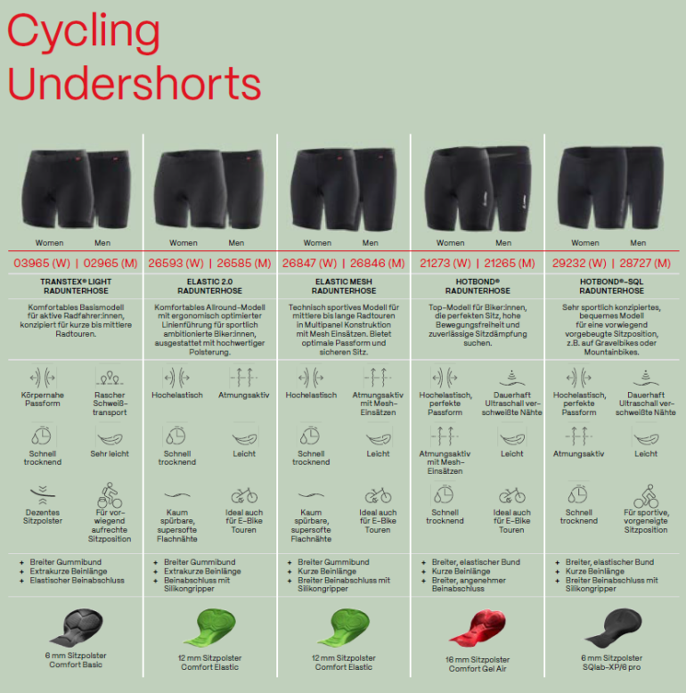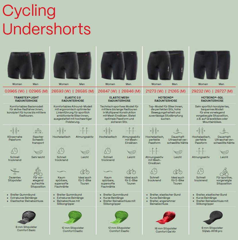 Die sportliche Radunterhose ist auch als kurze oder leichte Sommerradhose tragbar und für Herren als Bib-Shorts erhältlich.