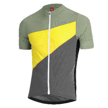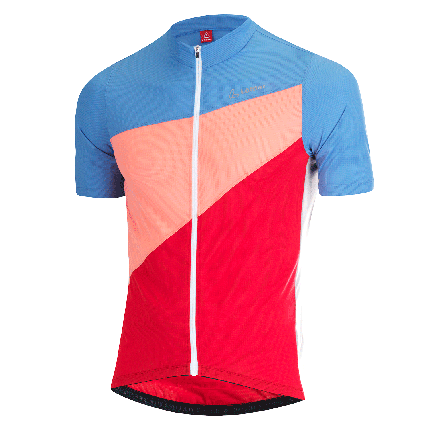 Dir ist sicher das außergewöhnliche Design bereits aufgefallen. Die Zusammenstellung dieser Farben hat einen Grund: Um die optimale Ausnutzung des Stoffs zu erzielen, besteht das Trikot aus mehreren Schnittteilen und verschiedenen Farben. Dadurch erhöht sich die Stoffausnutzung im Schnittlagenbild. Das heißt: Im Vergleich zu einem einfärbigen Trikot können wir mit einem bunten Design mehrere Stoffreste schneller wiederverwenden und reduzieren damit die zu entsorgenden Stoffe wesentlich.