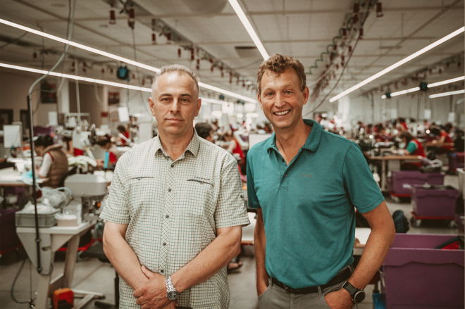 Angel Leonov und Otto Leodolter im Nähsaal in Bulgarien. Die beiden Geschäftsführer stimmen sich regelmäßige persönlich vor Ort ab.