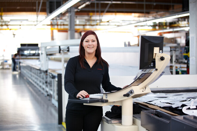 • Zuschnitt moderner, funktioneller Sportbekleidung auf computergesteuerten Zuschneideanlagen (Cutter System Lectra)